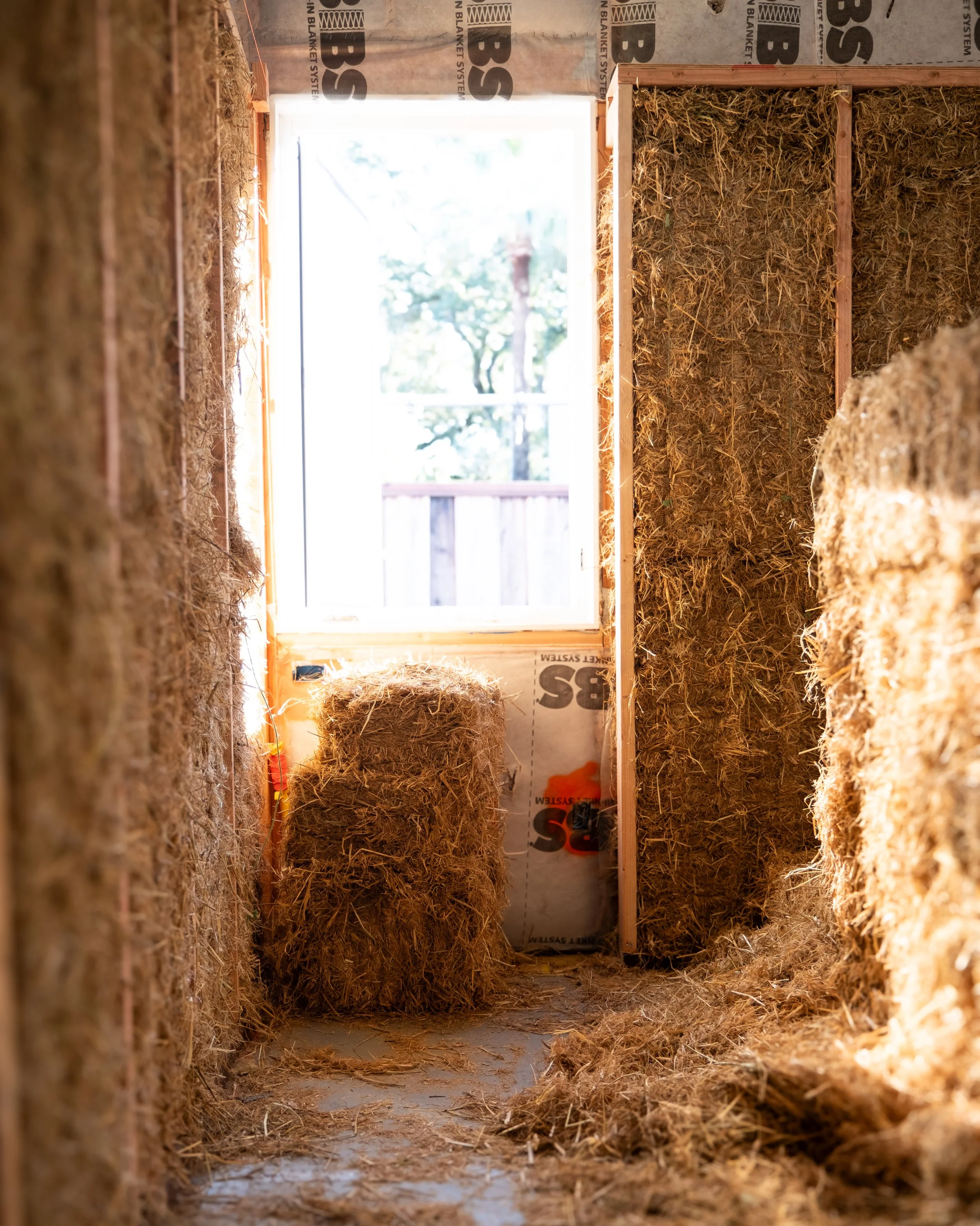 An exciting alternative is to use it in our buildings. Straw bales store about 128-165 kgC02/m3, making them one of the best ways to capture carbon from the air and store it in a building. A dense straw bale, when properly detailed and finished with a clay or lime-plaster skin, is highly fire resistant, insulative, and sound dampening while also regulating interior humidity and providing a thermal lag well suited to offset the swing from hot days to cool nights.