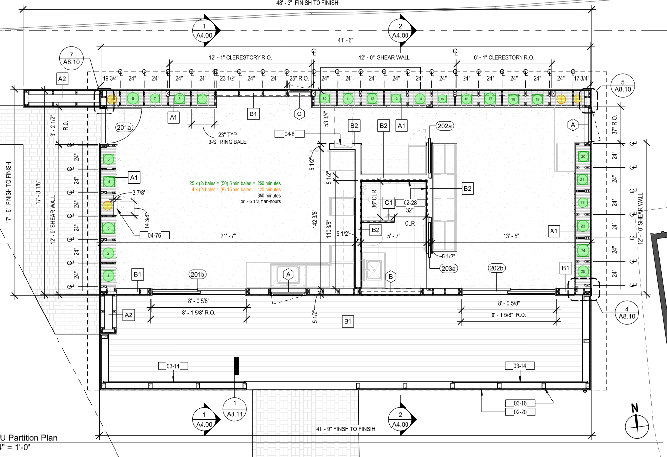 This starts with designing to the dimensions where bale walls and wood framing overlap. The bale portions of the wall are held to 8-feet - the height of two bales stacked on end, and the limit of a standard sheet of plywood. In plan the bale walls are long, solid masses running on a 2ft module. We cluster doors, windows, plumbing, and electrical into typically framed 2x6 portions of the wall to eliminate the complexity of incorporating those elements into the bale walls.