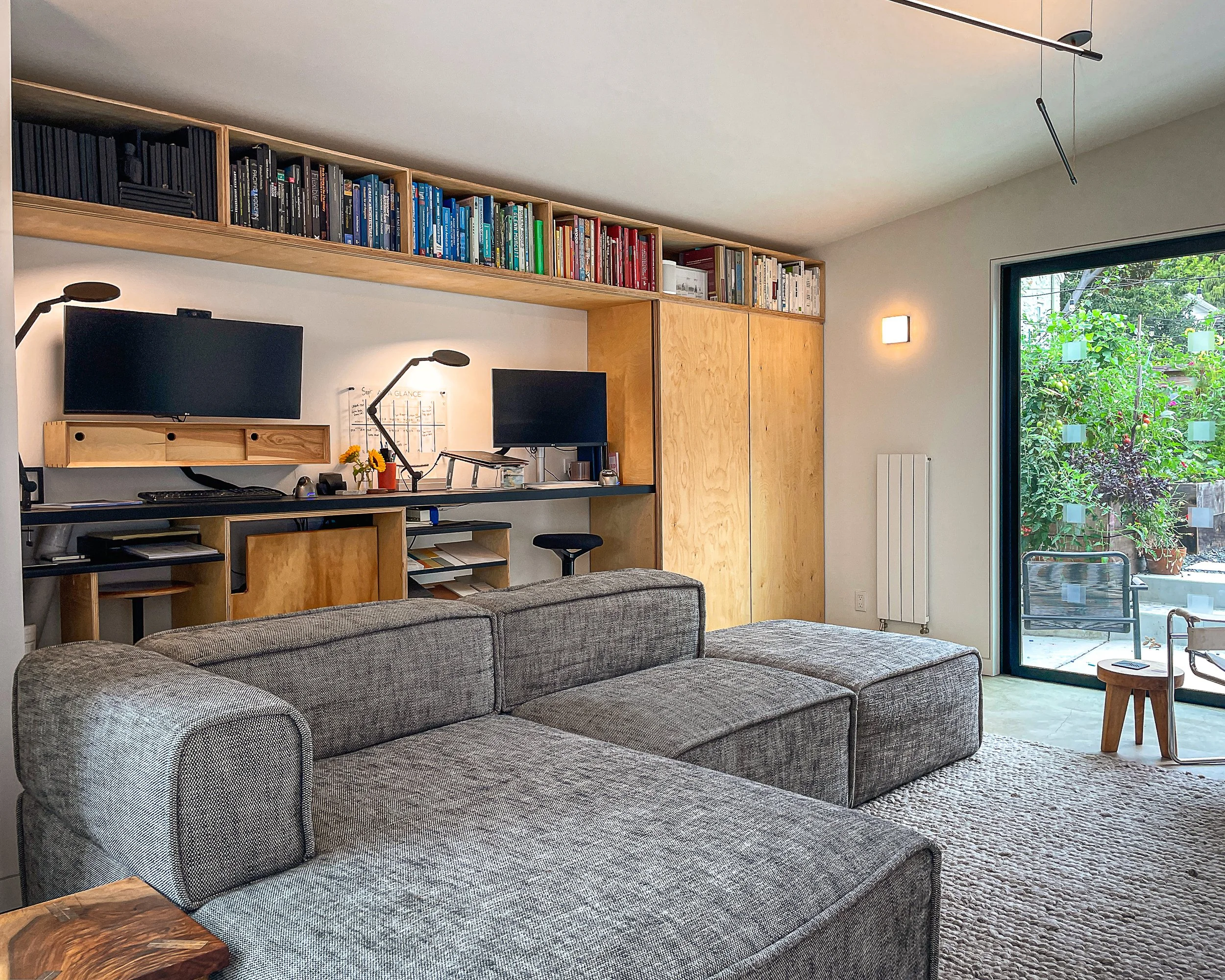 A desk built into the wall behind sliding panels so the room can be an office during the day and a family room at night.