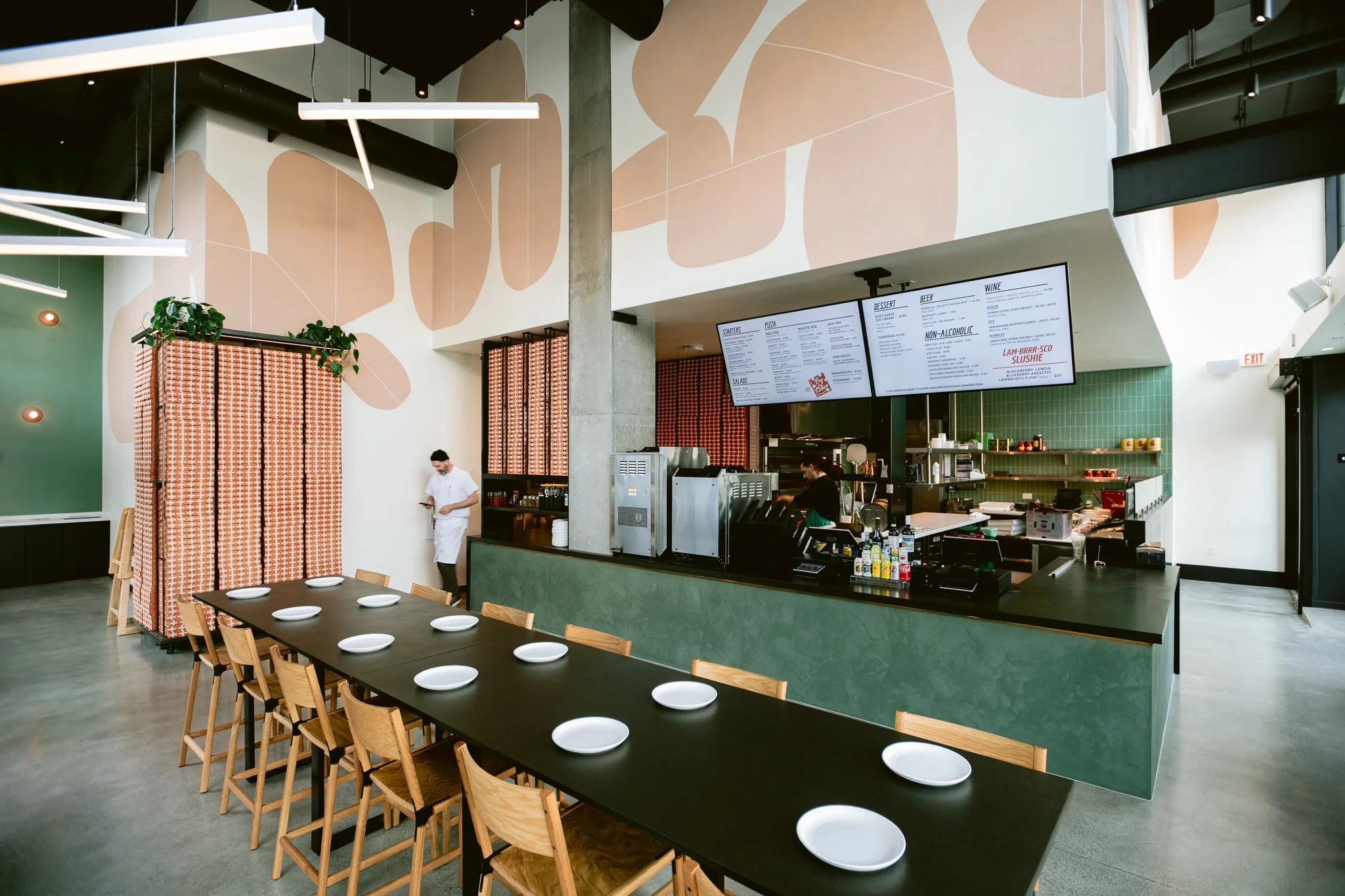 The 2,000-sf space is located on the ground floor of the new Lark Uptown apartment tower near the northwest corner of Lake Merrit right off Harrison Street on 24th. With the new apartment towers on either side of 24th and both Tarts de Feybesse and Highwire Coffee just across the street there was the opportunity to contribute growing a vibrant pedestrian nexus at the corner of 24th and Waverly. We decided to take advantage of the floor to ceiling glass along the storefront and line the dining room with counter seating facing out to the sidewalk and center a large communal table in the middle of the space. These communal seating arrangements both engage with the pedestrian life of the neighborhood as well as foster casual connections among our guests.